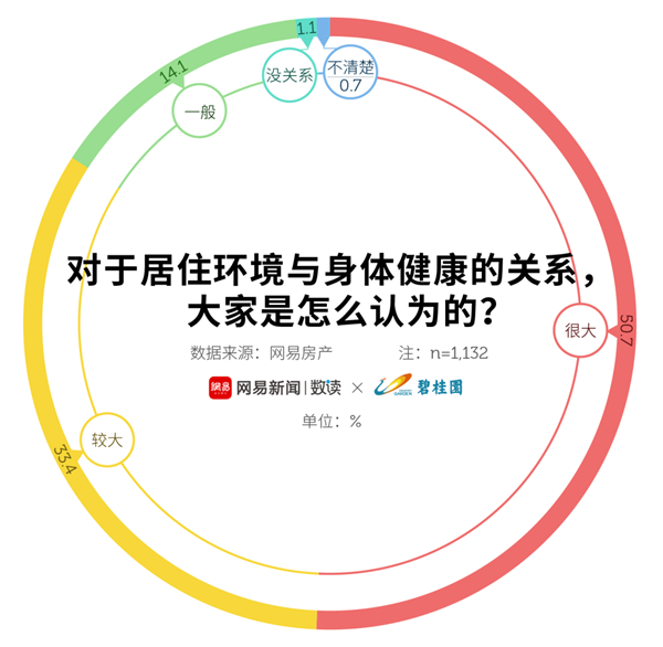 網(wǎng)易房產(chǎn)的調(diào)查數(shù)據(jù)顯示,在居住環(huán)境與身體健康的關系中,有50.7%的受訪者認為居住環(huán)境和身體健康的關系很大,33.4%認為關系較大,只有1.1%的人覺得沒有關系。